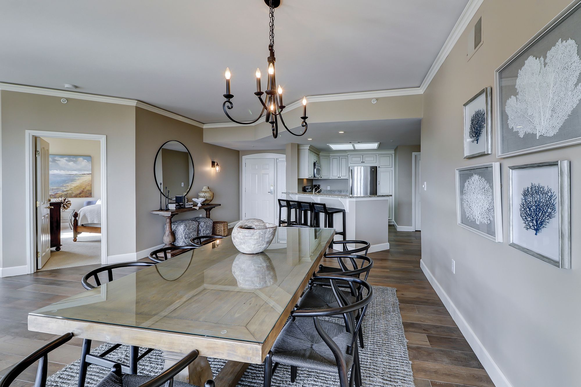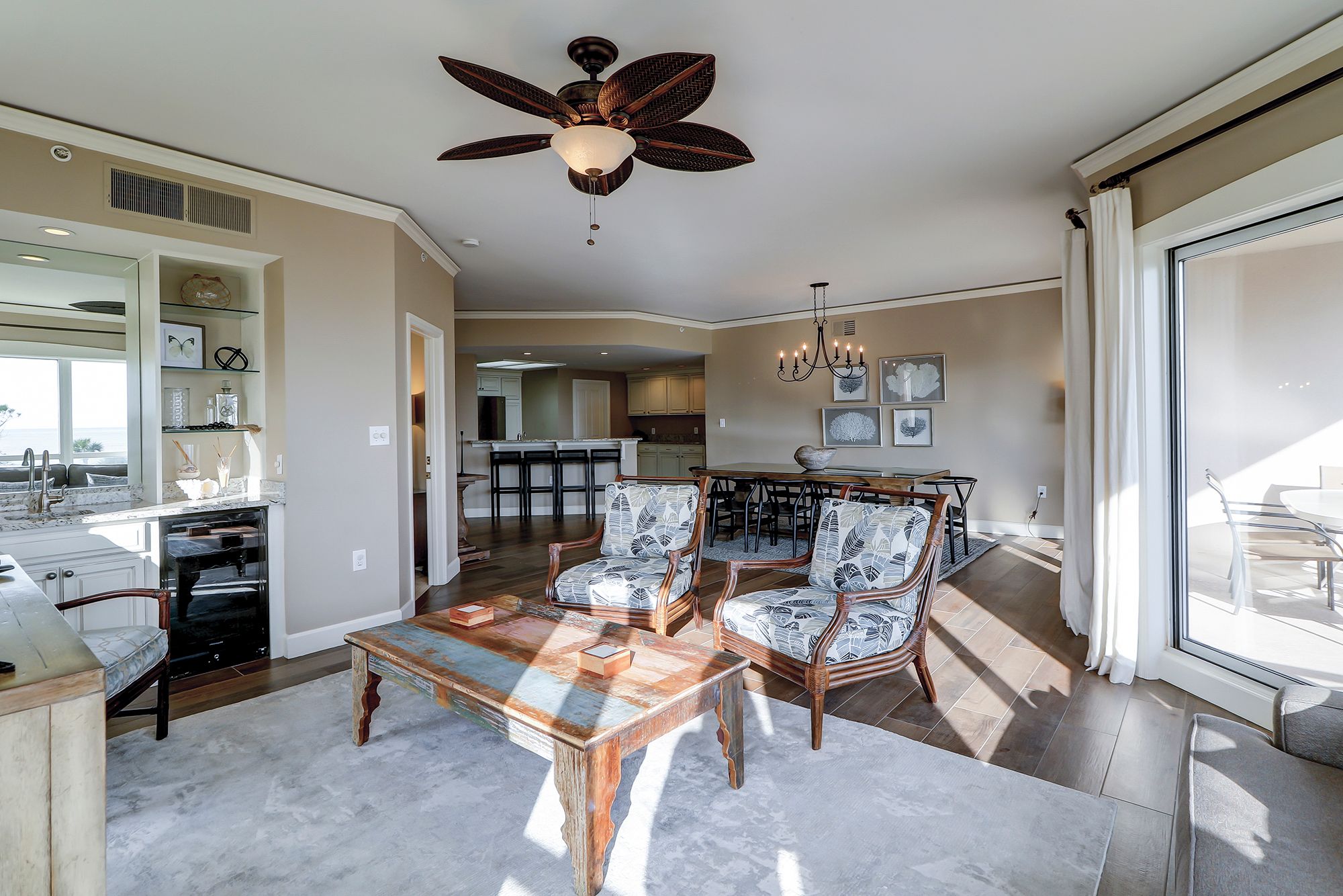 This stunning oceanfront villa features all of the comforts for a first class getaway on Hilton Head Island. From its beautiful furnishings to its amazing ocean views, you will find it all! In the living room features a sofa, three chairs, and a large TV. The wonderful ocean views are highlighted by huge windows and a sliding glass door to a large private balcony. The kitchen features updated granite countertops, stainless steel appliances throughout, wine cooler, and bar seating for up to 4. The dining area opens to the living room and kitchen and seats 8 with ocean views.