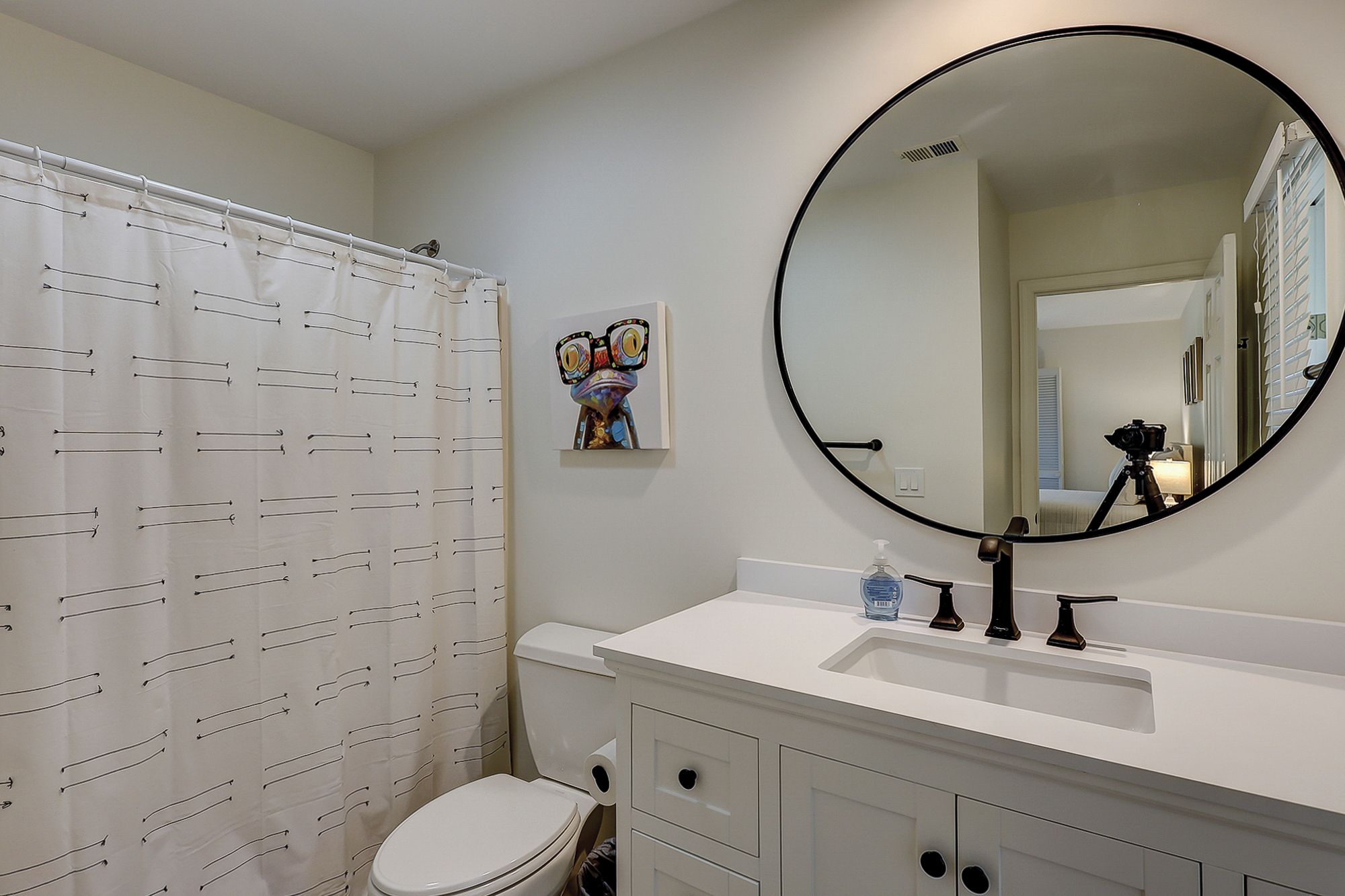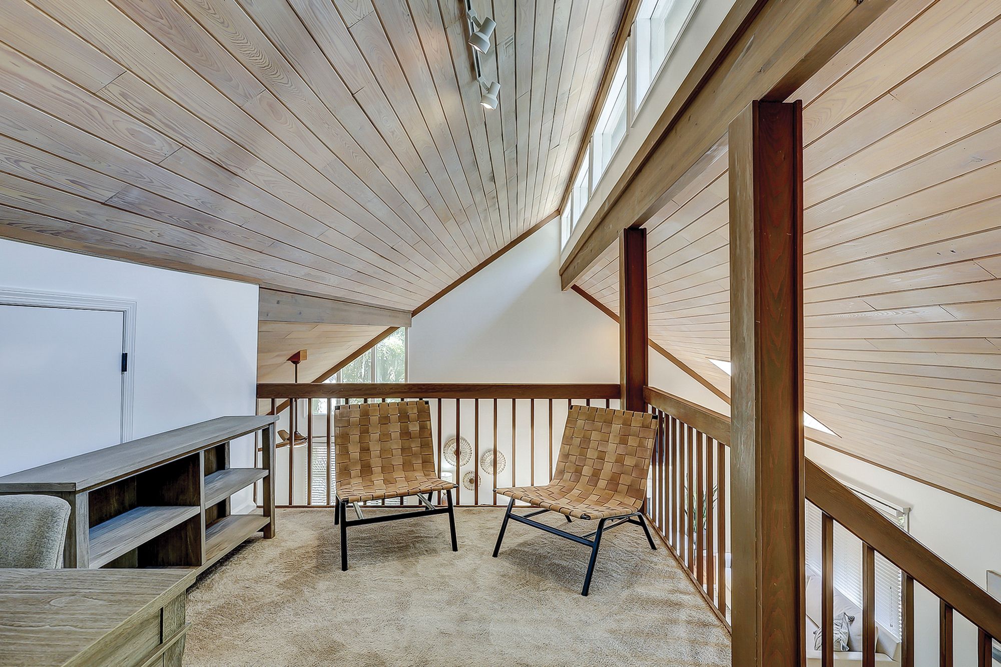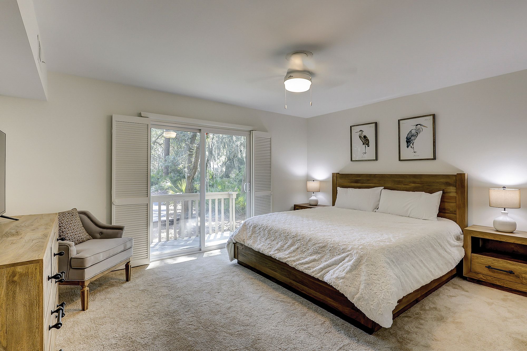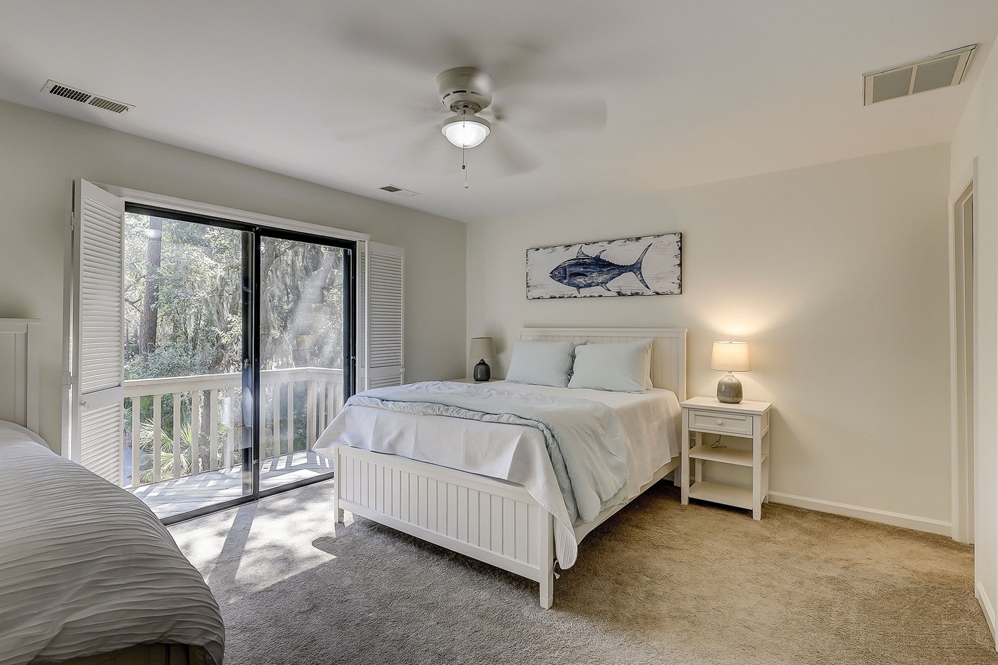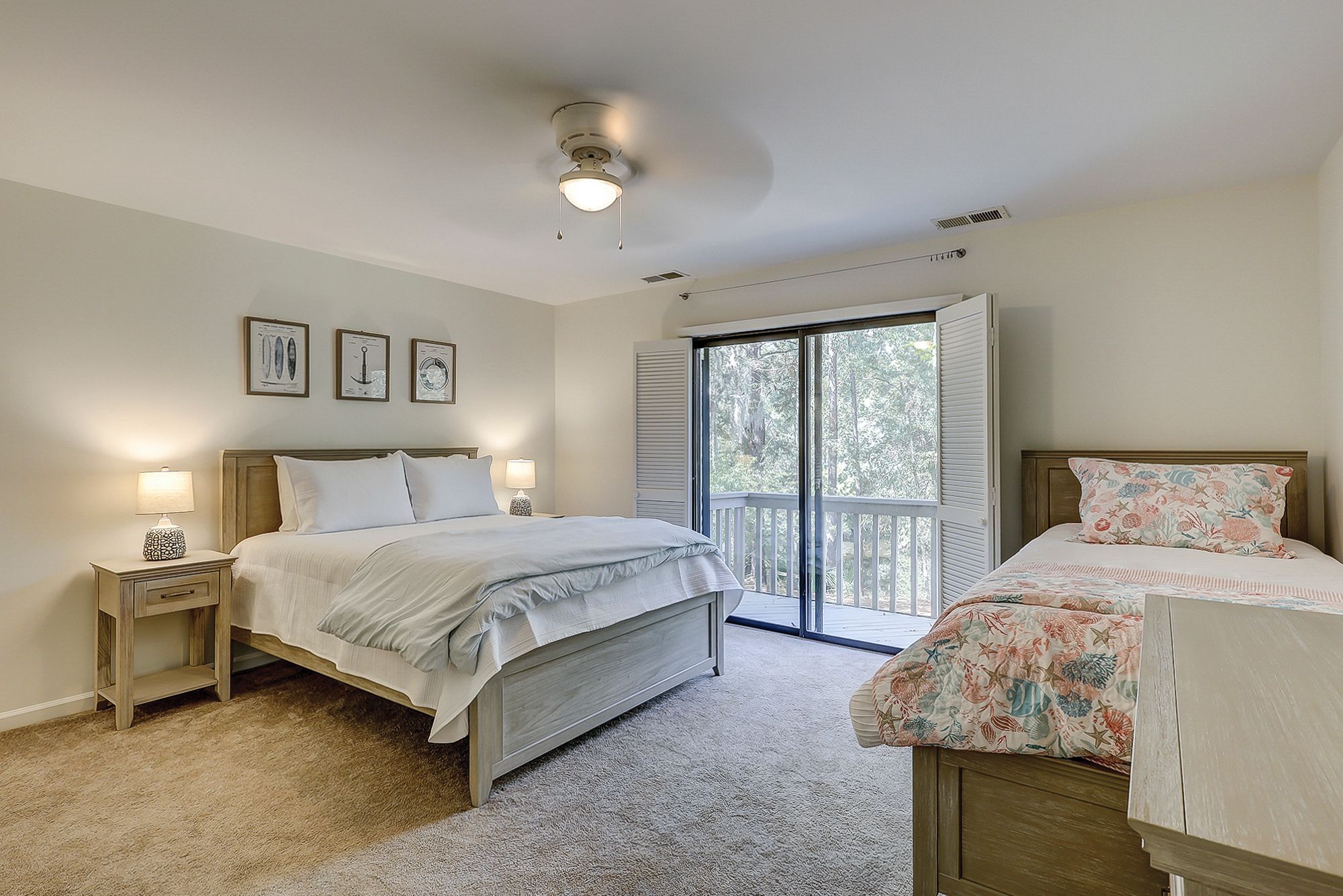 The two master suites are on the main level. The first faces the front of the house and has a king bed, TV, slider to a little patio, and access to the shared hall bath with a shower/tub combo. The second has a king bed, TV, slider to the large back porch, and a private bath with a walk-in shower. Upstairs you will find a small loft with a desk and the other two bedrooms. Each of these bedrooms has a queen bed and a twin trundle bed, small balconies, and a private bath with a shower/tub combo.
