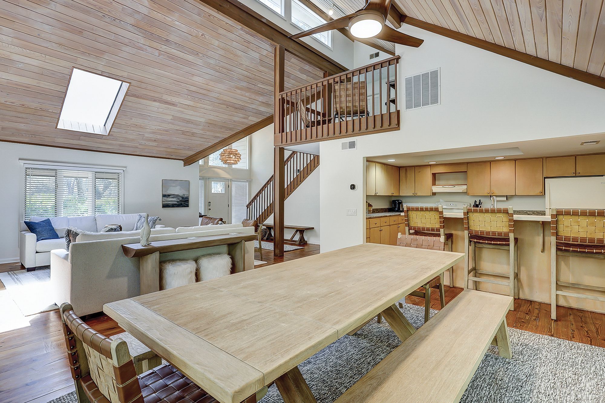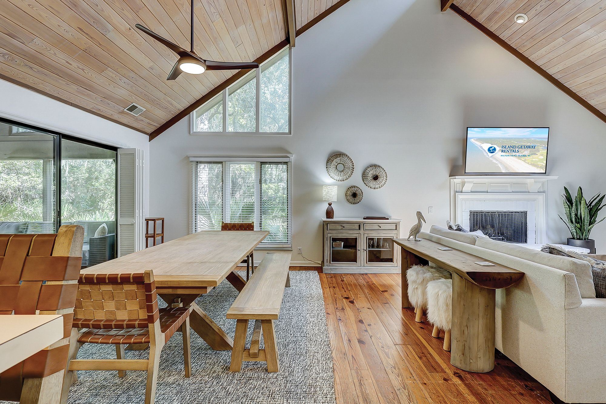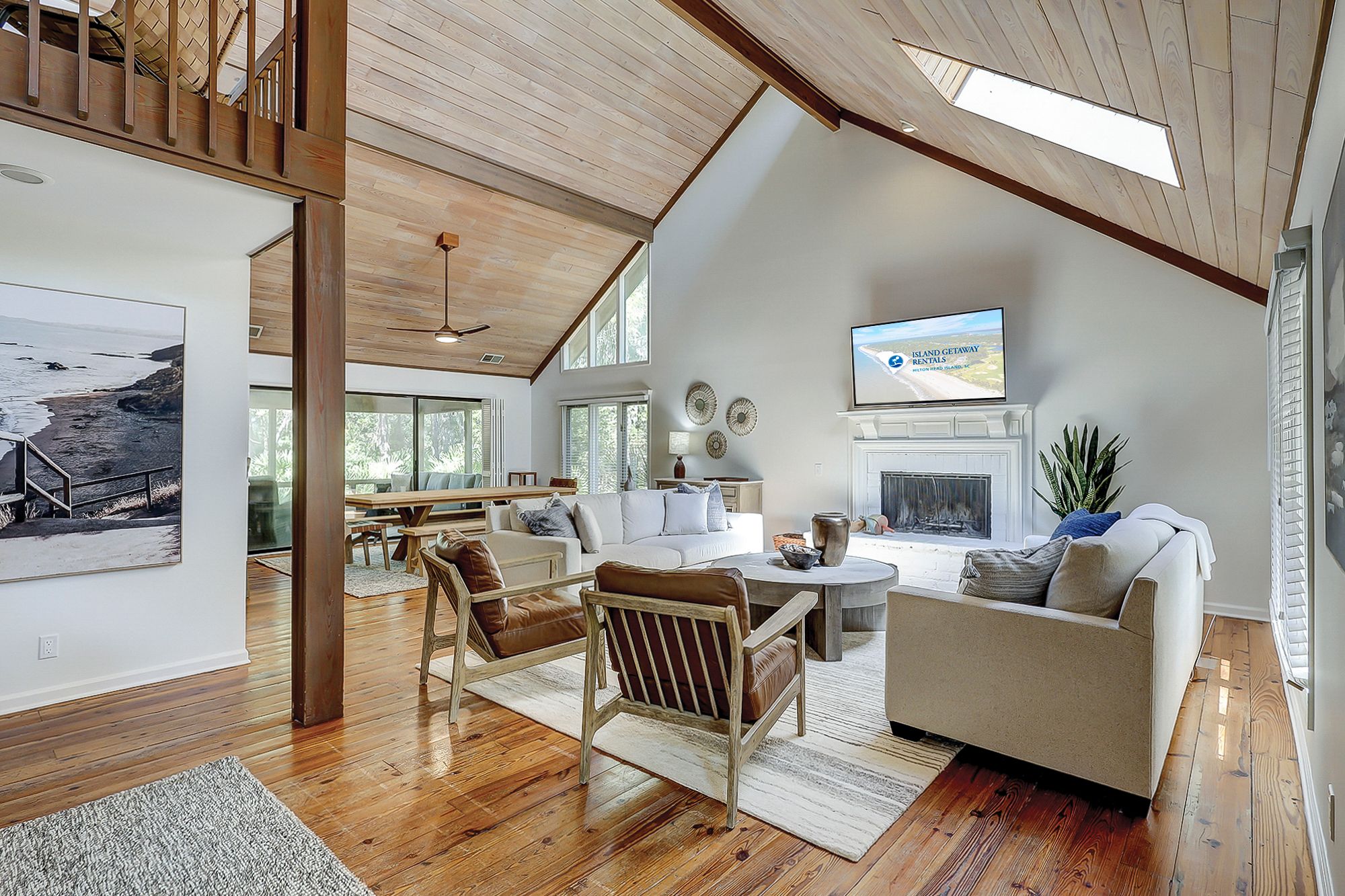 The home boasts an open-concept design with comfortable furniture and high ceilings, creating a warm and inviting atmosphere. The living room is perfect for gatherings, featuring a decorative fireplace, large dining table big enough for the whole family, and easy access to a fantastic screened in porch. The spacious kitchen overlooks the great room and has three bar stools. Large picture windows overlooking the landscape make you feel like you are in a private escape, but only steps from the beach!