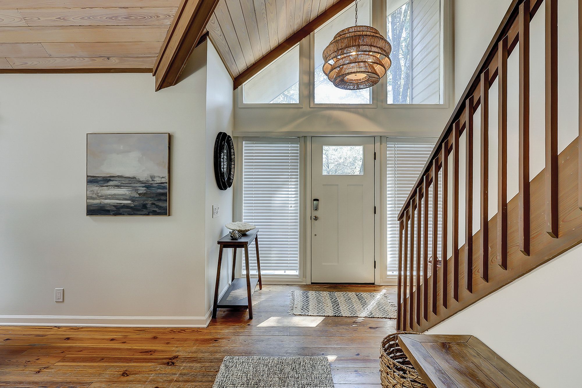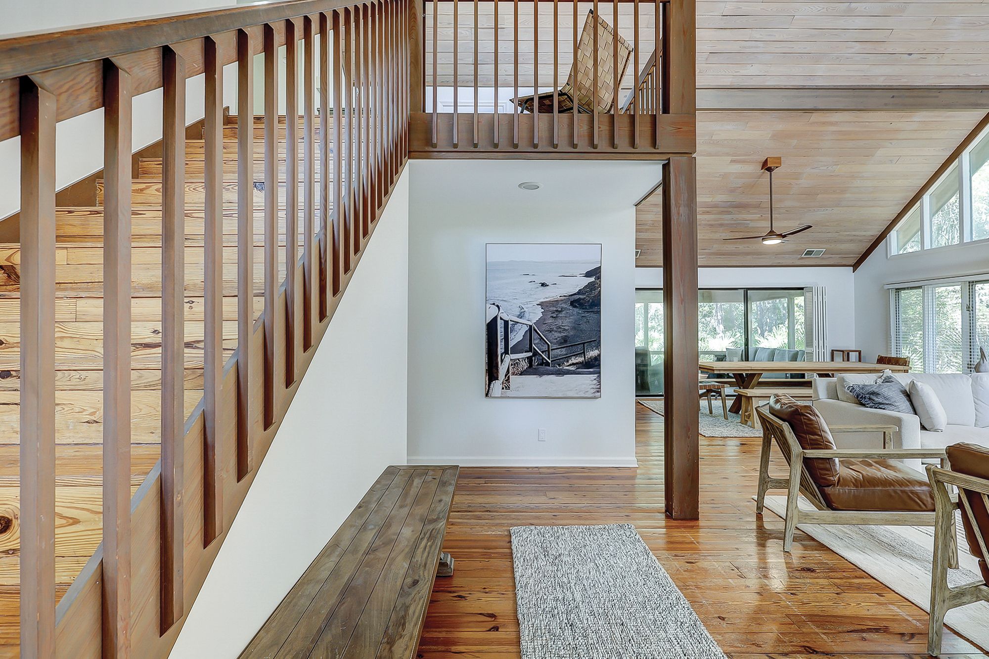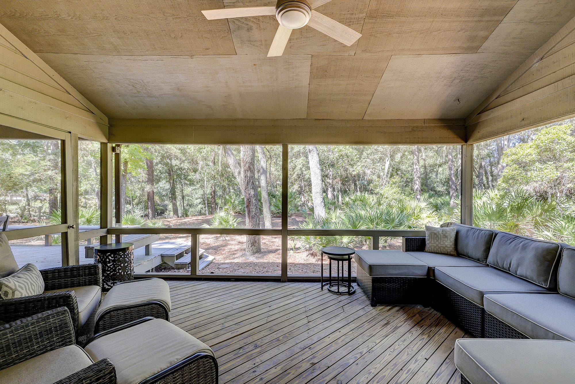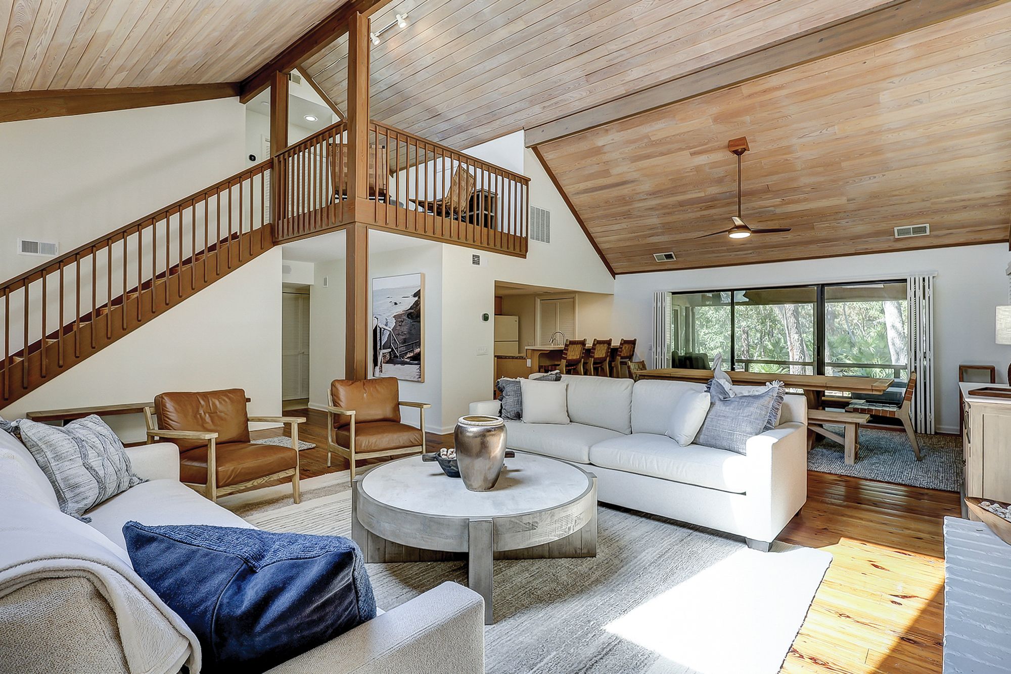 The home boasts an open-concept design with comfortable furniture and high ceilings, creating a warm and inviting atmosphere. The living room is perfect for gatherings, featuring a decorative fireplace, large dining table big enough for the whole family, and easy access to a fantastic screened in porch. The spacious kitchen overlooks the great room and has three bar stools. Large picture windows overlooking the landscape make you feel like you are in a private escape, but only steps from the beach!
