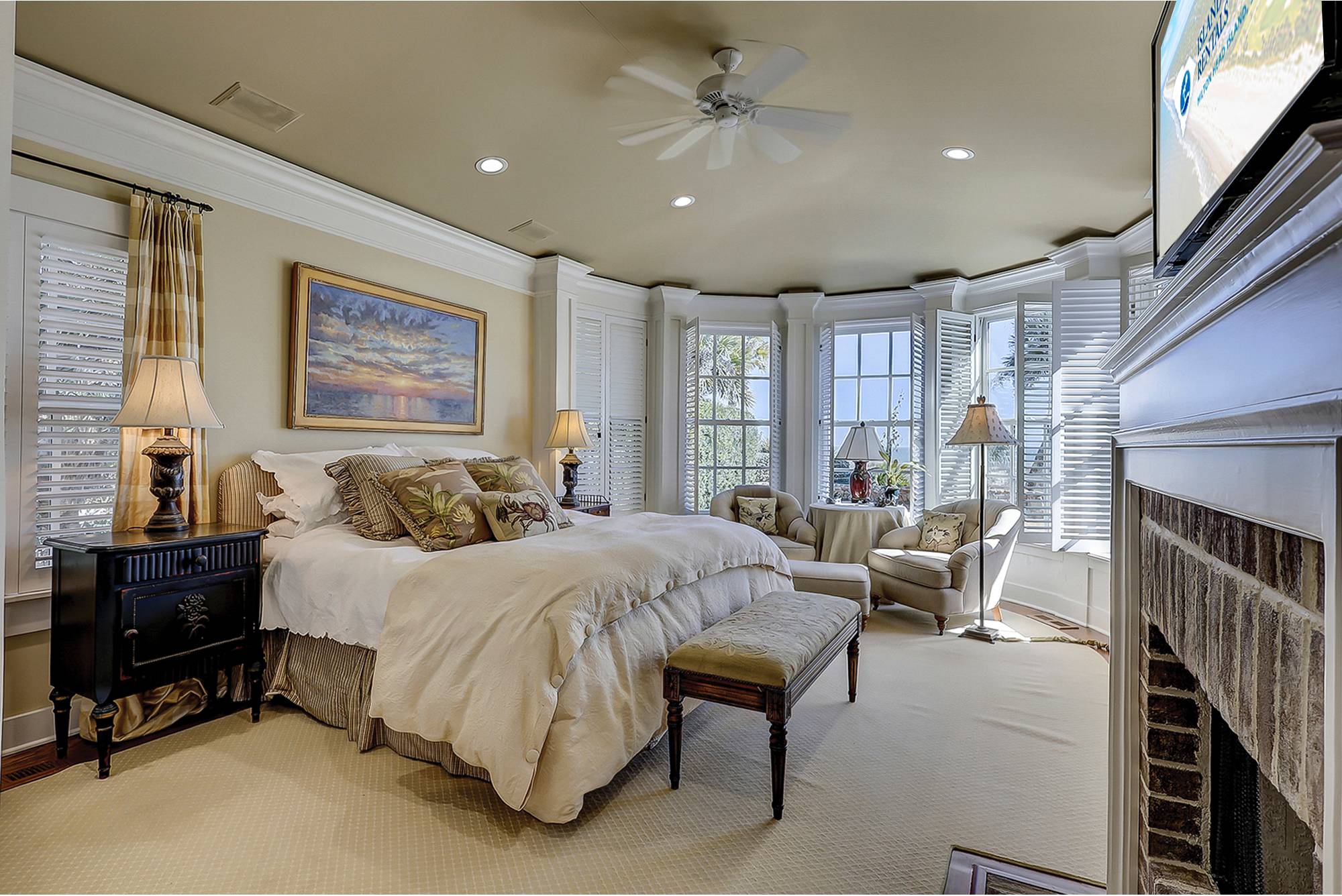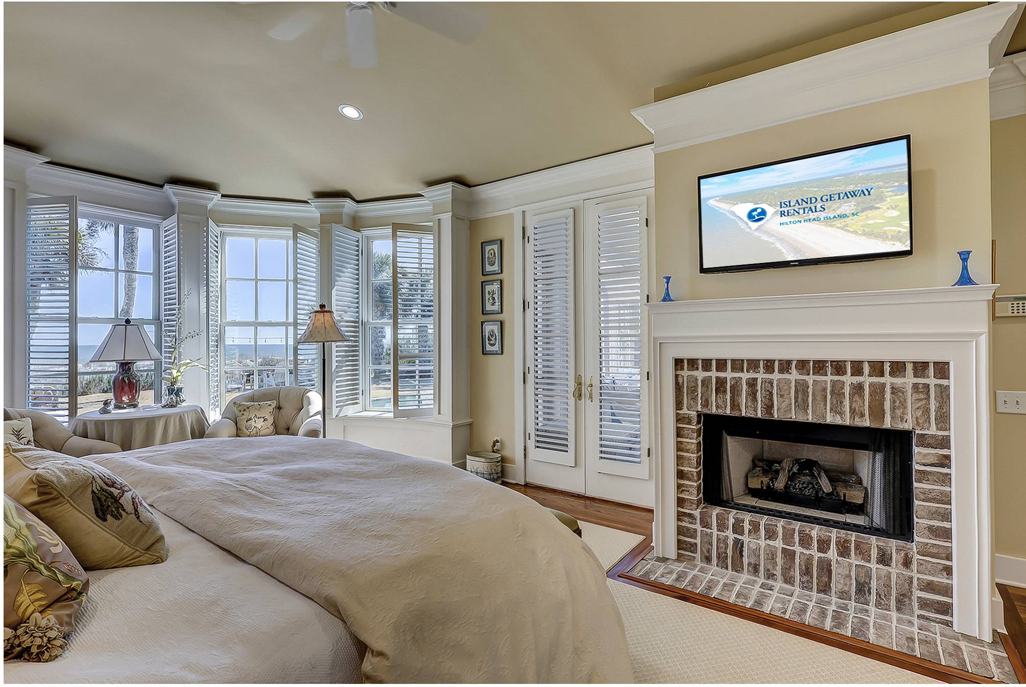 - King bedroom with TV, private bathroom, and direct access to screened in porch